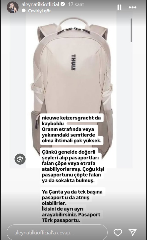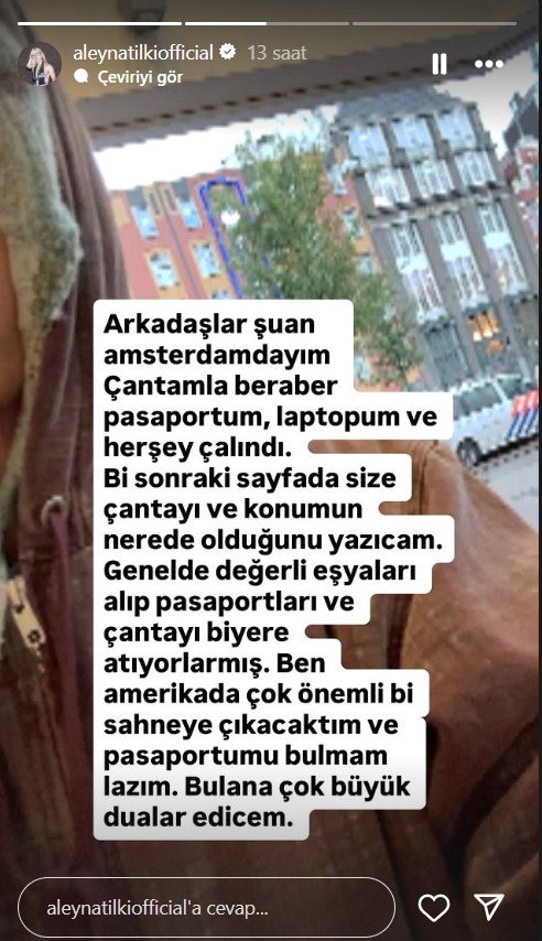 Aleyna Tilki, kapkaç olayının Amsterdam’daki Nieuwe Keizersgracht bölgesinde gerçekleştiğini açıkladı. Çantanın model görselini de paylaşan şarkıcı, kapkaççıların genellikle değerli eşyaları alıp pasaport gibi belgeleri çevreye veya çöp kutularına attığı yönündeki yaygın bilgiyi aktardı. Bu durumun ışığında Tilki, takipçilerinden özellikle çalınan çantanın kendisini ya da tek başına Türk pasaportunu Nieuwe Keizersgracht ve yakın çevresindeki semtlerde aramalarını rica etti. Çoğu kişinin pasaportunu bu şekilde bulduğunu belirterek, her iki ihtimalin de değerlendirilmesi gerektiğini ifade etti.